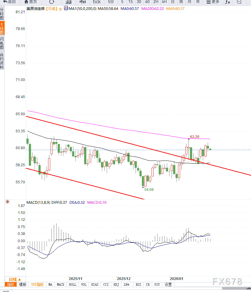 从日线图形来看,WTI原油在前期强势反弹后,当前走势呈现出高位震荡整理特征。价格在上探 61.80–62.00美元区间 后遇阻回落,表明该区域汇聚了较强的技术性抛压和获利了结盘。