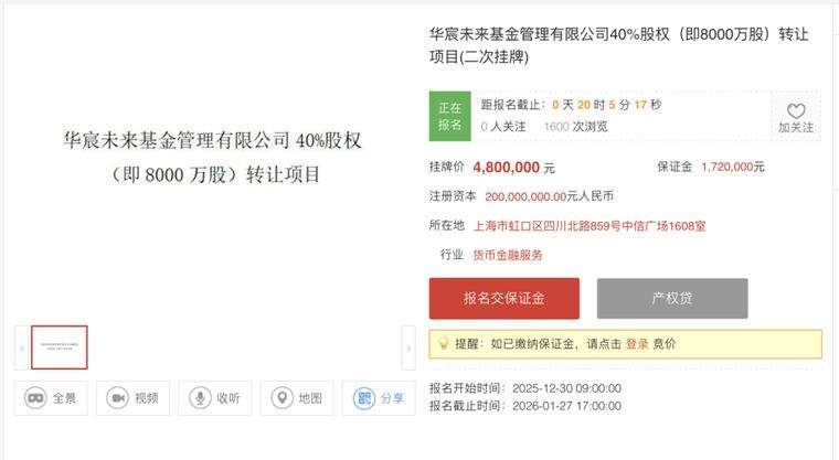 还值得关注的是,华宸未来基金此前已出现股权处置动作。记者在全国产权交易中心官网上看到,华宸未来基金40%股权(即8000万股)转让项目已经在二次挂牌,报名时间从2025年12月30日至2026年1月27日。