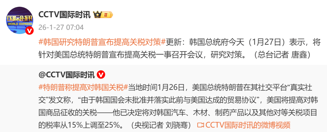 据央视新闻:当地时间1月26日,美国总统特朗普在其社交平台“真实社交”发文表示,由于韩国国会未批准并落实此前与美国达成的贸易协议,美方将提高对韩国商品征收的关税税率。
