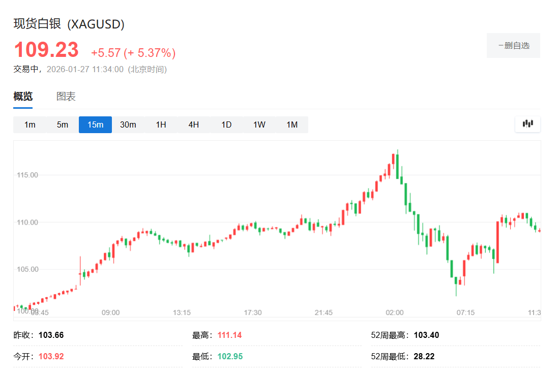 白银表现更为抢眼,周二反弹至每盎司110美元上方,此前一日创下117.69美元的历史新高后几乎回吐全部涨幅。这一白色金属今年迄今已暴涨55%。