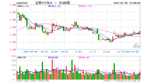 1月5日证券ETF龙头(560090)份额减少3150.00万份,最新份额26.64亿份,最新规模35.28亿元