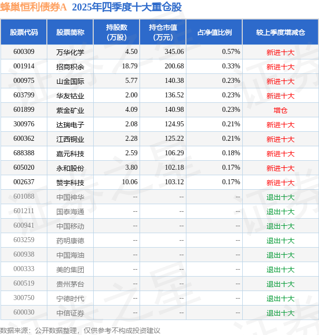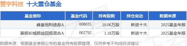 根据2025基金年报公募基金重仓股数据,重仓该股的公募基金共2家,其中持有数量最多的公募基金为蜂巢基金的蜂巢恒利债券A。蜂巢恒利债券A目前规模为1.9亿元,最新净值1.1956(1月26日),较上一交易日下跌0.05%,近一年上涨4.47%。该公募基金现任基金经理为李海涛 李铮男。李海涛在任的基金产品包括:蜂巢添鑫纯债A,管理时间为2019年7月17日至今,期间收益率为23.13%;蜂巢丰瑞债券A,管理时间为2021年4月29日至今,期间收益率为87.33%;蜂巢丰和债券A,管理时间为2022年3月16日至今,期间收益率为12.27%。李铮男在任的基金产品包括:蜂巢润和六个月持有期混合A,管理时间为2024年11月1日至今,期间收益率为9.96%;蜂巢丰颐债券A,管理时间为2025年1月17日至今,期间收益率为5.32%;蜂巢丰瑞债券A,管理时间为2025年12月2日至今,期间收益率为1.62%。