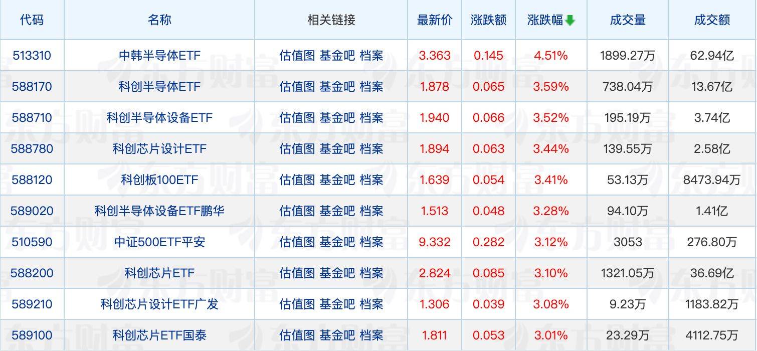 ETF涨跌幅方面,中韩半导体ETF涨超4%,多只科创半导体相关ETF走强。