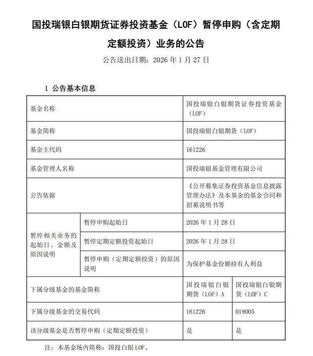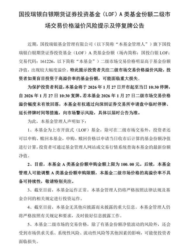 22日,国投白银LOF发布公告称,该基金21日收盘价明显高于基金份额净值,投资者如果盲目投资于高溢价率的基金份额,可能面临重大损失。国投白银LOF于2026年1月22日开市起停牌至收市。