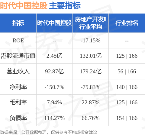 时代中国控股港股市值2.45亿港元,在房地产开发Ⅱ行业中排名第125。主要指标见下表: