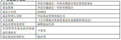 中国经济网北京1月27日讯 今日,华富基金公告,陈启明离任华富成长企业精选股票、华富价值增长混合、华富卓越成长一年持有期混合、华富成长趋势混合。