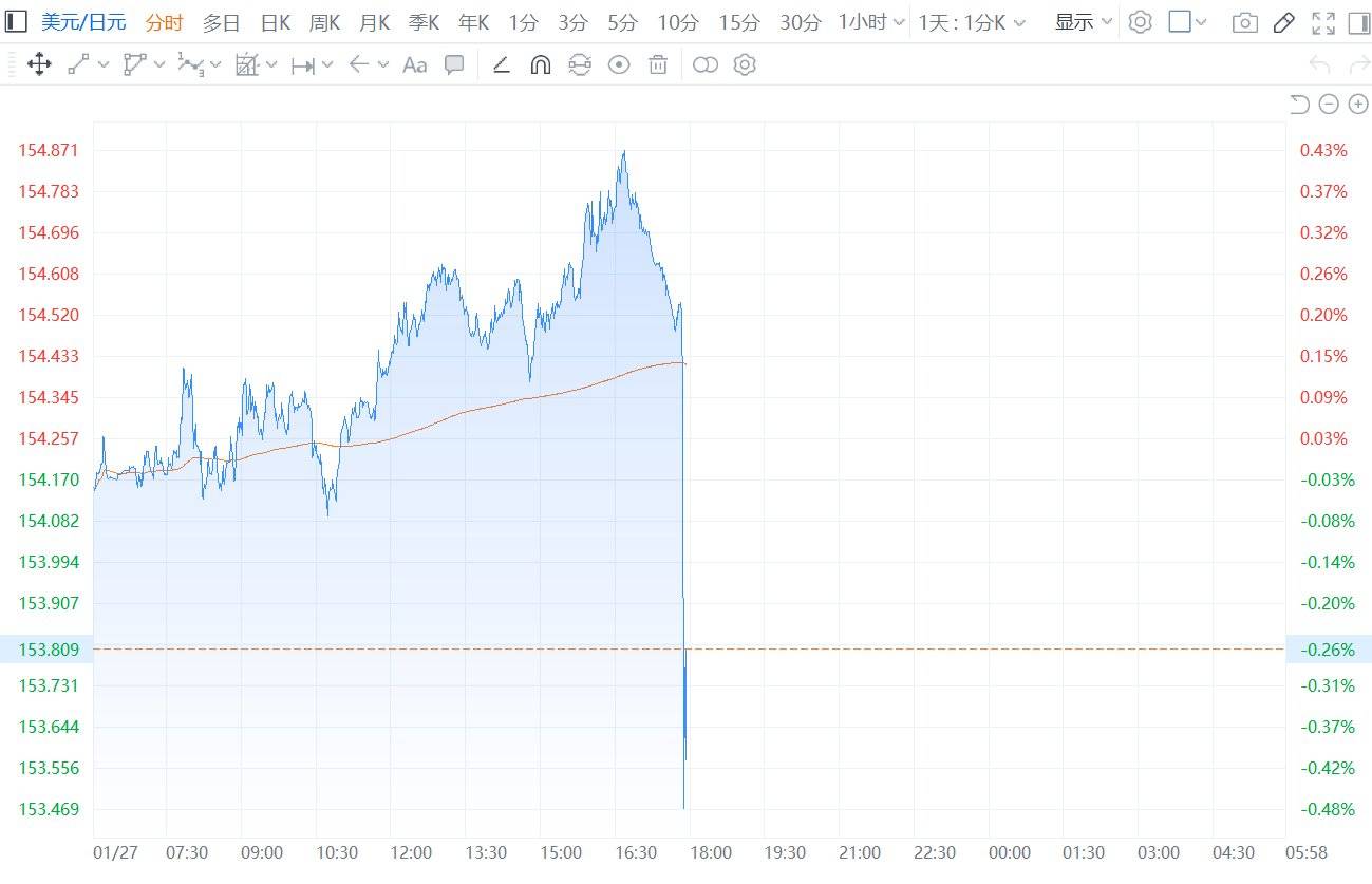 格隆汇1月27日|美元指数DXY短线下跌超20点,现报96.9。美元兑日元、欧元、英镑突发跳水,美元兑日元USD/JPY短线一度下挫近140点,最低至153.16。欧元兑美元EUR/USD短线拉升20余点,现报1.1883。英镑兑美元GBP/USD短线拉升24点,现报1.3690。