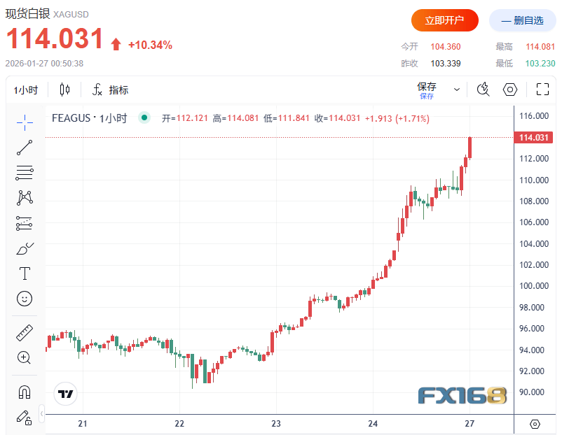 FX168财经报社(北美)讯 白银周一(1月26日)再度上演“抛物线式”狂飙,盘中一度突破110美元/盎司并刷新历史新高,市场情绪迅速升温。多家媒体与机构指出,在财政赤字与通胀担忧、地缘风险升级、以及贵金属整体牛市氛围叠加之下,白银因市场体量更小、流动性更薄而被资金与情绪放大,短线波动呈现“越涨越急”的加速特征。