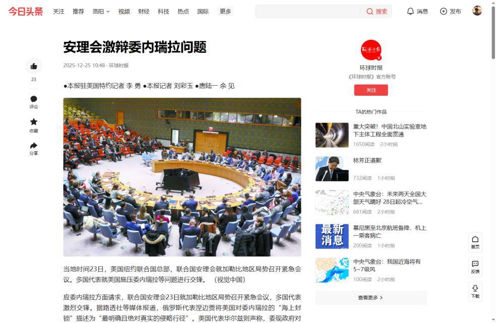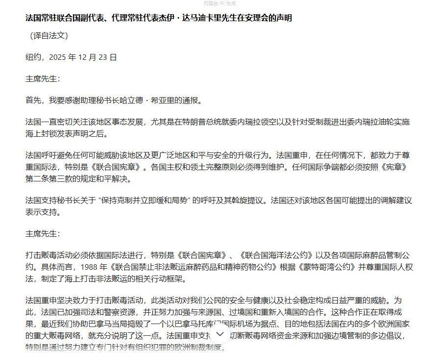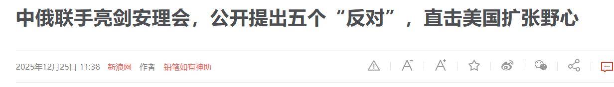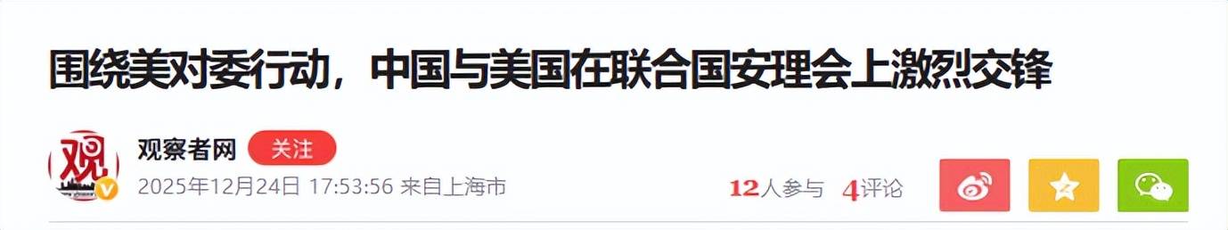 美方代表华尔兹强调马杜罗政权三大罪状:窃取选举成果、资助毒贩,以及构成最严重威胁的跨国恐怖主义和犯罪组织。 美国通过这种表态,向国际社会释放最强烈信号:如果无法推翻马杜罗政权,就不会轻易撤兵,对平民的侵害和扣押油轮的行为可能继续发生。 这也是为何委方代表蒙卡达直言,美国在加勒比海的军事行动与二战时期纳粹德国行为如出一辙,美国的目标远不止两艘油轮那么简单。 委内瑞拉在美国的军事与政治压迫下,国内局势极易动荡。美国在颜色革命方面经验老道,委内瑞拉此刻能做的,就是呼吁国际社会关注,就像近代中国历史上寻求外援以抵御侵略一样,小国在大国面前显得无力。 在联合国会议上,中俄坚定支持委内瑞拉。中方代表提出五条反对意见:反对单边霸凌、反对武力威胁、反对非法制裁、反对干涉内政、反对长臂管辖。 从批评美方行为侵犯主权到影响地区和平,中方的逻辑链条完整,信息证据充足。 俄罗斯代表则幽默地指出,美国扣押油轮和杀害平民的行为属于牛仔式行为,严重违反国际法。 至于在大国角力下小国的命运如何,目前还无法断言。加勒比海的风暴尚未真正到来,但可以观察到,美国的传统盟友已经开始出现分裂,并逐渐反对美国在该地区的行为。 例如法国代表发言时并未站在美国一边,谈到打击毒品时强调必须遵循国际法,而非单边霸凌。这说明,美国的霸权行为与盟友利益存在矛盾,越搞霸权,盟友受到的伤害越大,也就越远离美国,反过来削弱美式霸权。 目前来看,中方被扣押的油轮大概率能够回港,但原油可能无法收回。至于如何反击和补救,有一个可行方案:在近期美对台军售方案通过后,后续军火可以通过运输船进入中国海域。 届时,中国也可以采取类似美国的做法:你打击毒贩,我打击军火走私,这样的对抗在逻辑上也是合理的。 【信源:环球时报2025-12-25 安理会激辩委内瑞拉问题;观察者网2025-12-24 中国与美国在联合国安理会上激烈交锋】