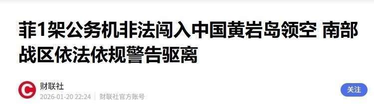 然而,她忽略了一个致命的漏洞:她所依赖的“靠山”——特朗普,早已公开表示中俄并非美国的主要敌人。更具讽刺意味的是,在日本外相访问菲律宾并签署军事后勤合作协议仅一天后,即1月20日,一架菲律宾公务机便未经许可闯入中国黄岩岛领空,随即被中国海空力量依法驱离。