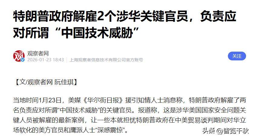 说特朗普是变脸高手,恐怕没人会反驳。可这一次,他的硬转弯来得太急,连白宫内部都跟不上节奏。1月22日,就在宣布将于4月访问中国的几个小时后,特朗普亲自推动解雇了两位关键的涉华官员。这两人可不是普通的公务员,而是掌控美国技术对华封锁核心政策的关键人物。就这样,特朗普还没出发,便先在自家清场了鹰派阵营的前排座位。这一变故,不仅让华盛顿的政客们瞠目结舌,也让北京看得颇为满意。