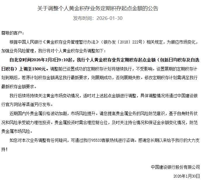 建设银行最新宣布,自北京时间2026年2月2日9时10分起,个人黄金积存业务定期积存起点金额(包括日均积存及自选日积存)上调至1500元。调整前已设置成功的定期积存计划将继续执行,不受影响。