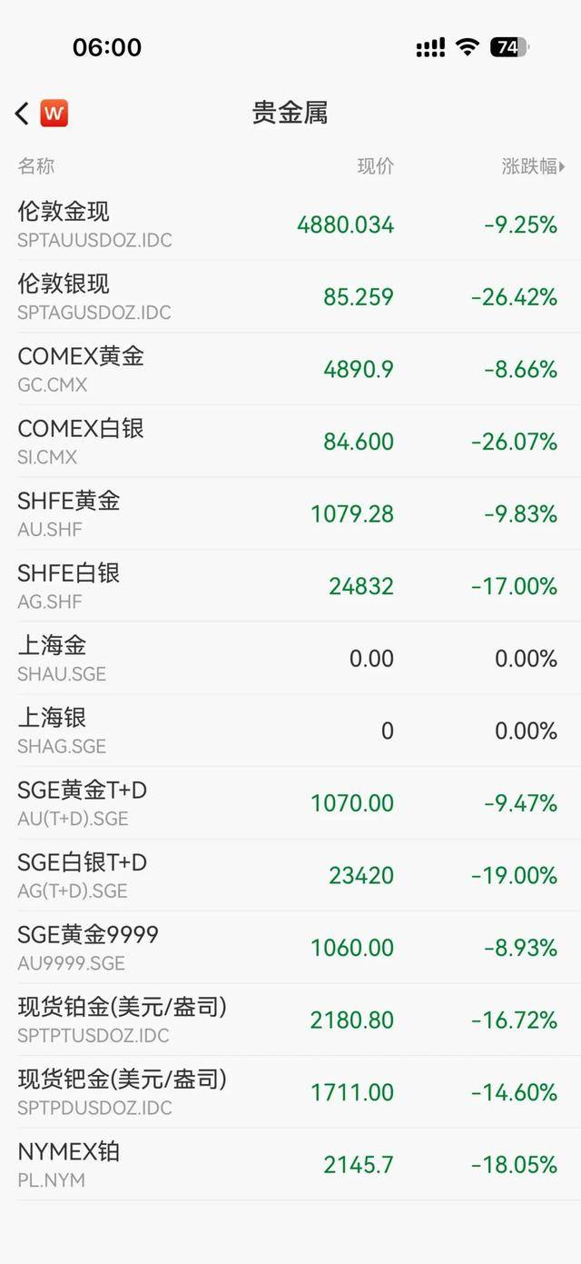截至发稿,伦敦金现跌9.25%报4880.034美元/盎司,伦敦银现跌26.42%报85.259美元/盎司,COMEX 黄金跌8.66%报4890.9美元/盎司,COMEX 白银跌26.07%报84.6美元/盎司。