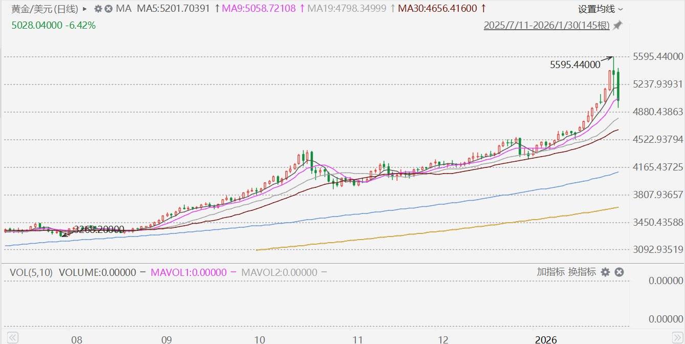 现货黄金一度跌8%至4941.79美元/盎司,较昨日盘中创出的历史最高价5595.44美元跌去11.6%。按全球黄金总市值约35万亿美元估算,市值蒸发了约4万亿美元。