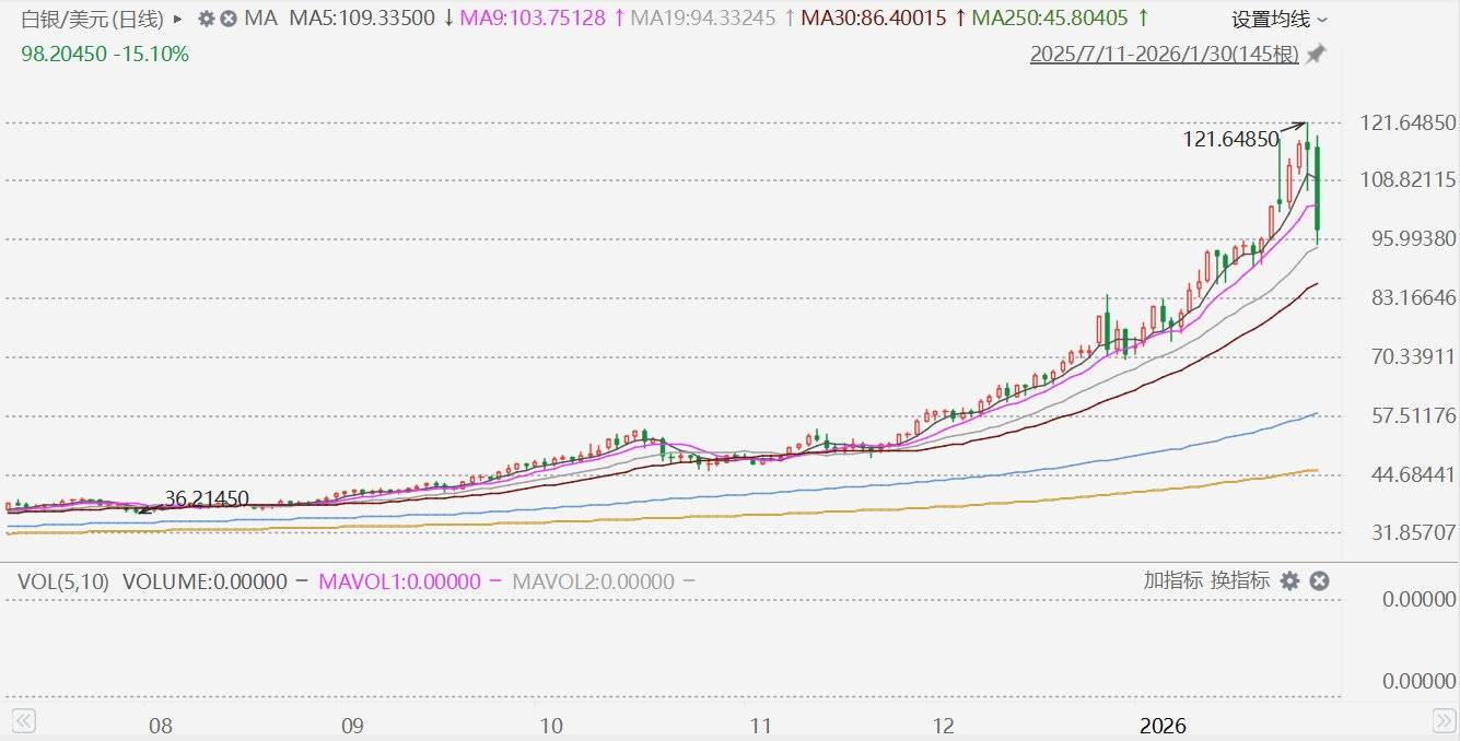 现货白银一度跌近18%至95.1105美元/盎司,较昨日盘中创出的历史最高价121.6485美元跌去27.9%。