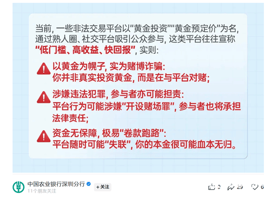 2026年1月,中国农业银行深圳分行还曾发布名为《警惕黄金预定价陷阱,当心赌博诈骗局!》的文章。