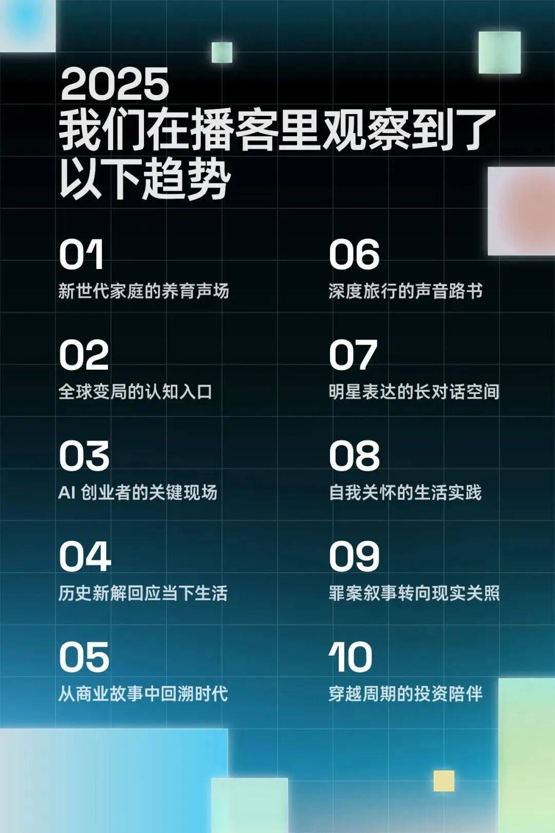回看过去一年的播客十大趋势,也展现出创作者们敏锐的时代观察。播客是“新世代家庭的养育声场”“全球变局的认知入口”“AI创业者的关键现场”,也是“深度旅行的声音路书”和“穿越周期的投资陪伴”等等。