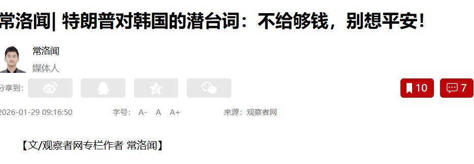 2026年1月26日,特朗普在社交媒体上写道:由于韩国国会没有通过此前与美国达成的协议,美方将提高对韩国商品的关税。他说,这项协议是在2025年7月30日由他和李在明签署的,并在2025年10月29日,特朗普访问韩国时再次确认过。原本,这份协议的内容是,美国将对韩国商品征收15%的统一关税,而作为交换,韩国将向美国提供3500亿美元的投资基金,并承诺购买1000亿美元的能源产品,此外,韩国市场也将全面对美国开放,意味着零关税进入。然而,特朗普现在却表示,鉴于韩国尚未通过这一具有历史意义的贸易协议,美方决定将对韩国的关税上调,特别是对于韩国的汽车、木材、制药产品等,税率将从15%提高至25%。