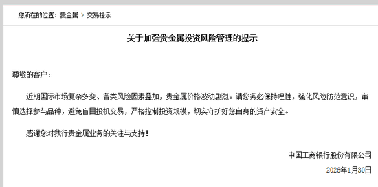 1月30日,工商银行官网发布《关于加强贵金属投资风险管理的提示》。上述提示通告表示,近期国际市场复杂多变、各类风险因素叠加,贵金属价格波动剧烈。请您务必保持理性,强化风险防范意识,审慎选择参与品种,避免盲目投机交易,严格控制投资规模,切实守护好您自身的资产安全。