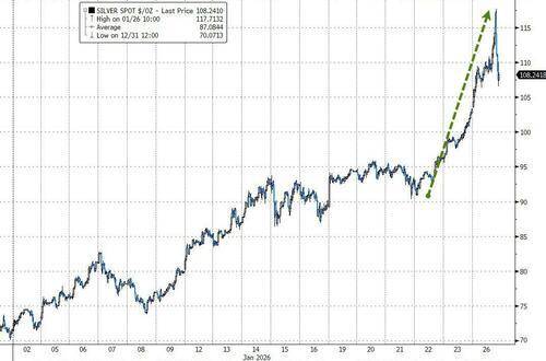 白银在纽约中午刷新历史高位至接近118美元的水平,随后快速回吐涨幅。分析认为,白银这轮抛物线式上涨已经明显显露出疲态,价格走势越来越像一次“冲顶式见顶”。