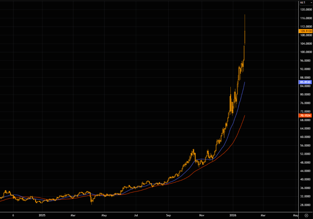 据LSEG Workspace数据,渴望入场的投资者以及空头正在恐慌性买入上行波动率期权。白银波动率指标VXSLSLV目前徘徊在106附近,盘中一度触及124,意味着市场正在为每日约7%的价格波动定价。这种波动率水平对于Meme股票而言已属极端,对于白银这类硬资产更是史无前例。