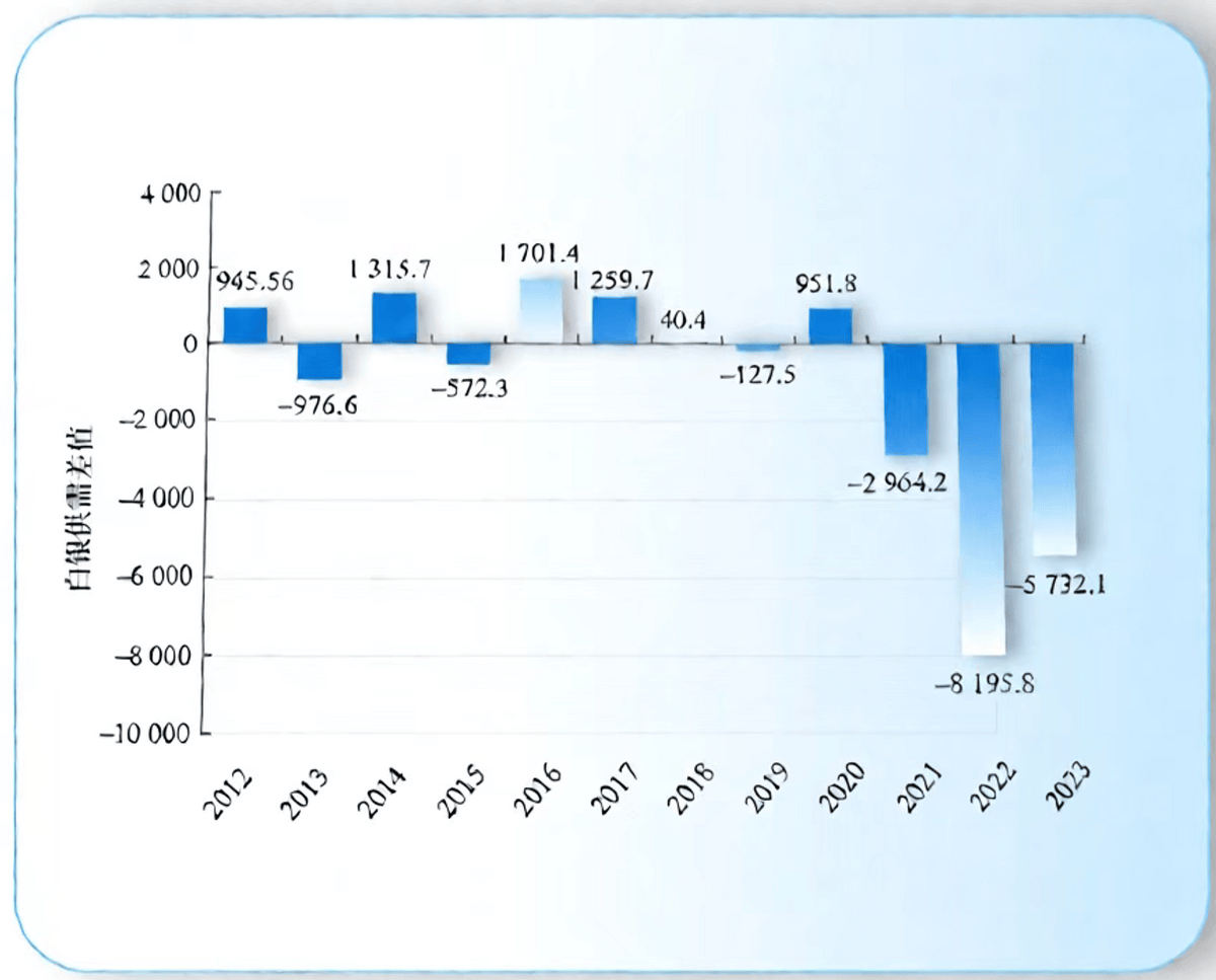 在2012年—2020年之前,全球白银的供应量大部分时候高于需求量,供应总体偏过剩,但从2021年开始,白银的需求结构发生了显著变化。由于工业需求激增,而矿山产量下降,白银供应开始出现明显缺口,直接把此前的过剩抹平了。