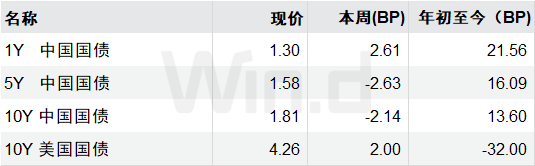 最近一周,1年期中国国债收益率累计上涨2.61个BP,5年期中国国债收益率、10年期中国国债收益率分别下跌2.63个BP、2.14个BP。10年期美国国债收益本周累计上涨2个BP。
