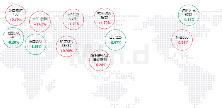 最近一周,全球主要股市表现分化。中国市场方面,恒生指数表现强势,累计涨幅达2.38%,沪深300指数小幅上涨0.08%,上证指数下跌0.44%,深证成指下跌1.62%;美国市场方面,标普500指数累计上涨0.34%,纳斯达克指数累计下跌0.17%;亚洲市场方面,韩国综合指数走势强劲,累计涨幅达4.7%;欧洲市场方面,MSCI欧洲指数累计上涨1.62%。