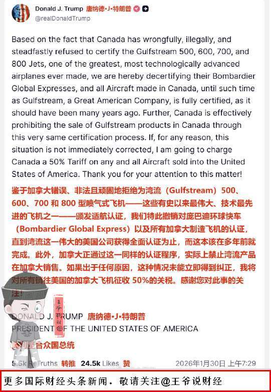 王爷说财经讯:翻脸比翻书还快!特朗普突然“下狠手”!你敢相信吗?就在这一周,曾经被视为“铁哥们”的美国和加拿大,居然在桌子上掀了盘子!当地时间1月29日,特朗普在社交平台上一举放出“重磅炸弹”:由于加拿大长期非法拒绝向美国的湾流公务机提供认证,美国不仅要暂停所有加拿大制造的飞机认证,还要对其加征50%的关税! 这到底怎么回事?一直以来,美国对外可谓是“横扫”敌人,打压对手,可这回,连自家的盟友也不放过!加上这50%的关税大棒砸下,加拿大的航空业还怎么活?特朗普的真实意图,真的是为了几架飞机的认证吗?