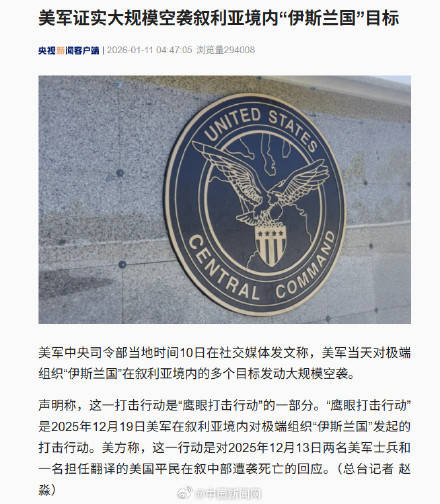 美军中央司令部当地时间10日在社交媒体发文称,美军当天对极端组织“伊斯兰国”在叙利亚境内的多个目标发动大规模空袭。 声明称,这一打击行动是“鹰眼打击行动”的一部分。“鹰眼打击行动”是2025年12月19日美军在叙利亚境内对极端组织“伊斯兰国”发起的打击行动。美方称,这一行动是对2025年12月13日两名美军士兵和一名担任翻译的美国平民在叙中部遭袭死亡的回应。(央视新闻客户端)