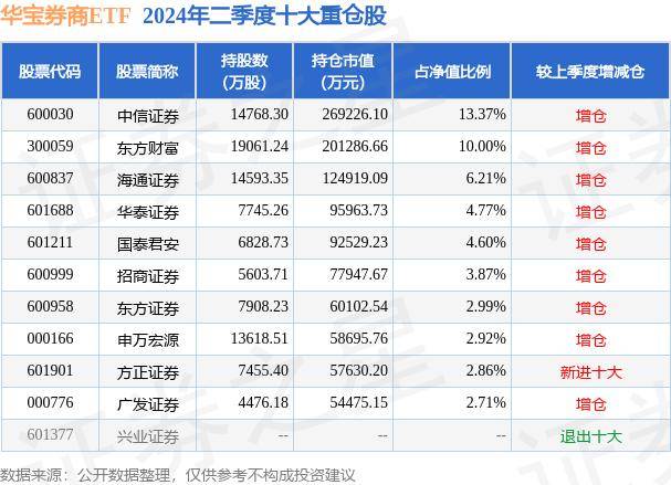 华宝券商ETF为指数型-股票基金,根据最新一期基金季报显示,该基金资产配置:股票占净值比99.52%,无债券类资产,现金占净值比0.58%。基金十大重仓股如下: