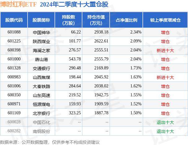 博时红利ETF为指数型-股票基金,根据最新一期基金季报显示,该基金资产配置:股票占净值比99.02%,无债券类资产,现金占净值比1.38%。基金十大重仓股如下: