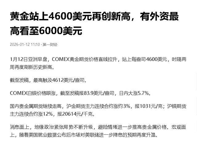 小毋今天想给大家好好聊一聊,黄金又又又创历史新高了,1月12日早盘一开盘,COMEX黄金期货价格就跟坐了火箭似的往上冲,直接冲破4600美元/盎司大关,最高还摸到了4612美元的高位。