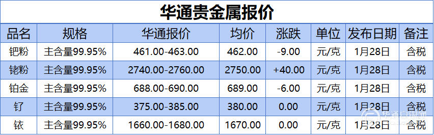 华通白银网 1月28日讯:钯粉、铑粉、铂金、钌、铱报价