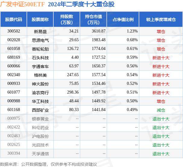 广发中证500ETF为指数型-股票基金,根据最新一期基金季报显示,该基金资产配置:股票占净值比97.39%,债券占净值比0.04%,现金占净值比2.22%。基金十大重仓股如下: