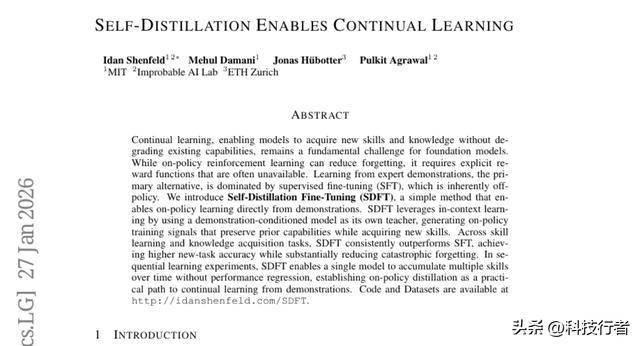 MIT、Improbable AILab与ETH Zurich的研究团队在2025年1月发表了一项关于人工智能持续学习的重要研究,该论文发表于arXiv,编号为arXiv:2601.19897v1。这项研究提出了一种名为"自我蒸馏微调"(Self-Distillation Fine-Tuning, SDFT)的创新方法,有效解决了人工智能模型在学习新技能时容易忘记已掌握技能的难题。