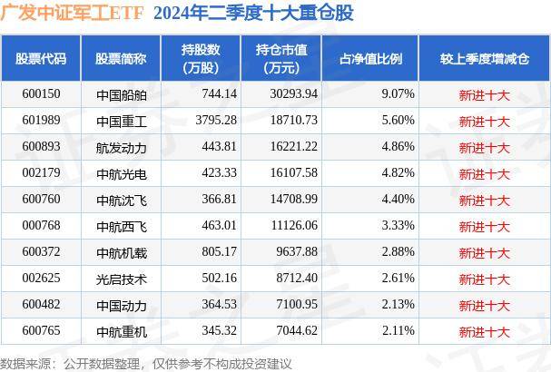 广发中证军工ETF为指数型-股票基金,根据最新一期基金季报显示,该基金资产配置:股票占净值比99.68%,无债券类资产,现金占净值比0.43%。基金十大重仓股如下: