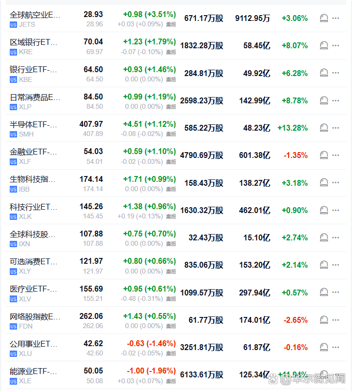 【航空业ETF收涨3.5%,领跑美股行业ETF,标普能源板块跌约2%】周一(2月2日),全球航空业ETF收涨3.51%,区域银行ETF、银行业ETF至多涨1.79%,半导体ETF涨1.12%,科技行业ETF涨0.96%,能源业ETF跌1.96%。