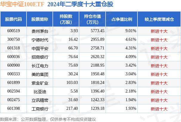 华宝中证100ETF为指数型-股票基金,根据最新一期基金季报显示,该基金资产配置:股票占净值比99.16%,无债券类资产,现金占净值比0.98%。基金十大重仓股如下: