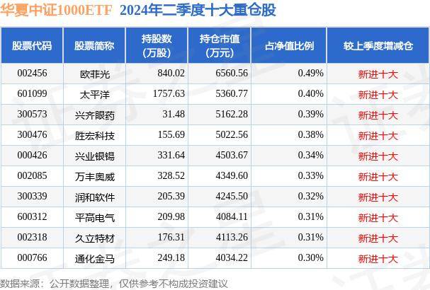 华夏中证1000ETF为指数型-股票基金,根据最新一期基金季报显示,该基金资产配置:股票占净值比98.72%,无债券类资产,现金占净值比1.46%。基金十大重仓股如下: