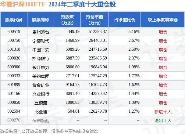 华夏沪深300ETF为指数型-股票基金,根据最新一期基金季报显示,该基金资产配置:股票占净值比99.57%,无债券类资产,现金占净值比0.47%。基金十大重仓股如下: