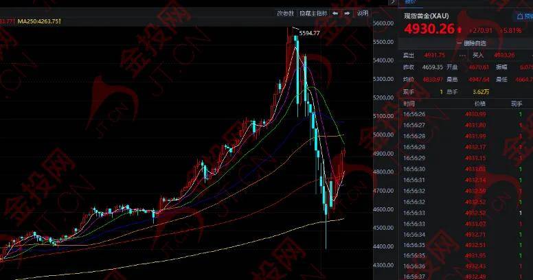 隔夜,现货黄金在欧盘前一度跌至4402.93的日内低点,随后有所反弹,单日振幅达480美元,最终收跌4.59%,报4660.91美元。今日欧市盘中,黄金大幅反弹,目前在4905美元附近徘徊。