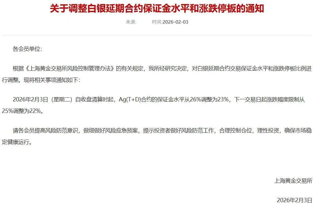 2026年2月3日(星期二)自收盘清算时起,Ag(T+D)合约的保证金水平从26%调整为23%,下一交易日起涨跌幅度限制从25%调整为22%。