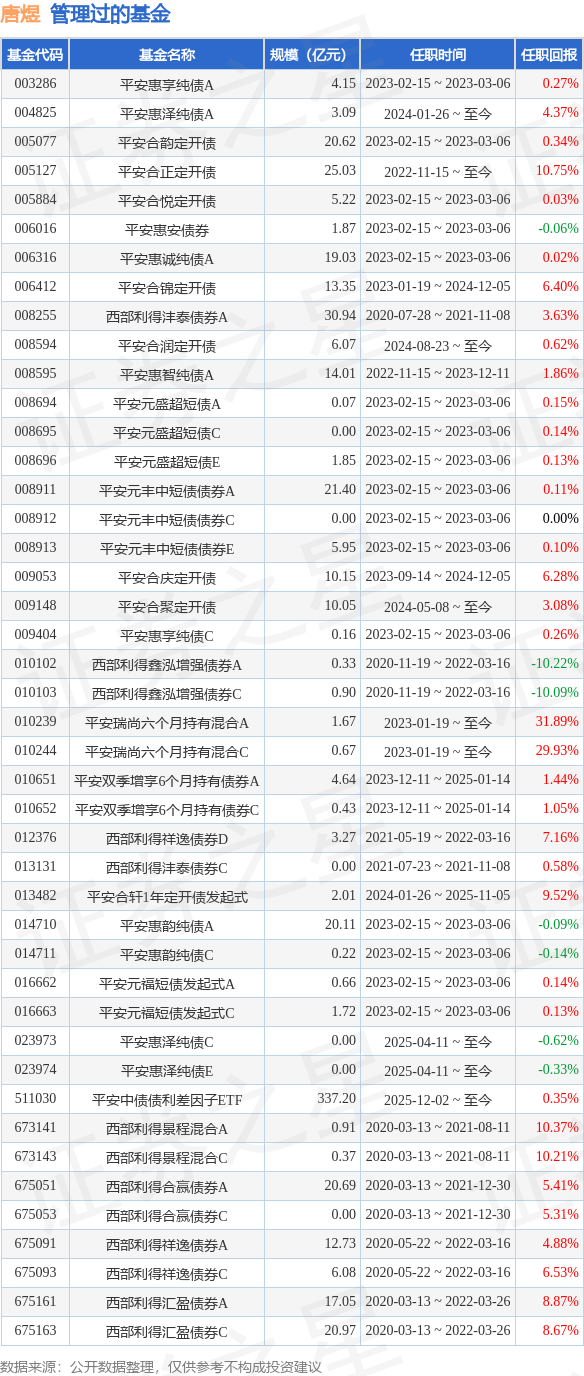 唐煜先生:中国国籍,南开大学经济学硕士,曾任广发银行总行资产管理部固定收益处投资经理,太平洋资产管理有限公司固定收益经理。2018年11月加入西部利得基金管理有限公司,具有基金从业资格。2020年3月13日至2021年12月30日担任西部利得合赢债券型证券投资基金基金经理。2020年3月13日至2022年03月26日担任西部利得汇盈债券型证券投资基金基金经理。2020年3月13日至2021年8月11日担任西部利得景程灵活配置混合型证券投资基金基金经理。2020年5月22日至2022年03月16日任西部利得祥逸债券型证券投资基金基金经理。2020年7月28日起至2021年11月8日担任西部利得沣泰债券型证券投资基金基金经理。2022年3月16日离任西部利得鑫泓增强债券型证券投资基金基金经理。2022年6月加入平安基金管理有限公司,2022年11月15日起担任平安合正定期开放纯债债券型发起式证券投资基金。2023年1月19日至2024年12月5日担任平安合锦定期开放债券型发起式证券投资基金基金经理。2023年1月19日任平安瑞尚六个月持有期混合型证券投资基金的基金经理。2023年9月14日至2024年12月5日担任平安合庆1年定期开放债券型发起式证券投资基金基金经理。2023年12月11日至2025年01月14日担任平安双季增享6个月持有期债券型证券投资基金基金经理。2022年11月15日至2023年12月11日担任平安惠智纯债债券型证券投资基金基金经理。2024年1月26日起担任平安惠泽纯债债券型证券投资基金基金经理。2024年1月26日至2025年11月5日担任平安合轩1年定期开放债券型发起式证券投资基金基金经理。2024年5月8日起担任平安合聚1年定期开放债券型发起式证券投资基金基金经理。现任平安合润1年定期开放债券型发起式证券投资基金基金经理。2025年12月2日任平安中债-中高等级公司债利差因子交易型开放式指数证券投资基金基金经理。