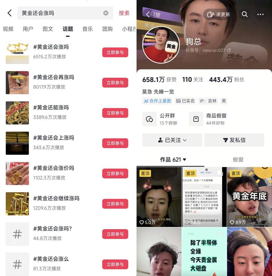 新榜数据显示,在抖音,近90天#黄金 话题播放量新增160亿次,#今日金价 话题播放量新增30亿次;在小红书,近30天黄金相关话题累计互动量新增超3077万,新增笔记超39万篇。其中,抖音博主“狗总”因为成功预测黄金走势,15天涨粉超264万,成为最近吃到最大流量红利的黄金博主;“韦雪”则在抖音连开3场黄金直播,预估GMV破亿。