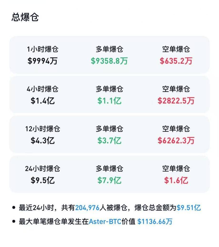 Coinglass数据显示,最近24小时内,加密货币市场超20万人被爆仓,爆仓总金额为9.51亿美元,其中,多单爆仓金额为7.9亿美元,空单爆仓金额为1.6亿美元。