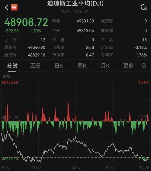 道指跌592.58点,跌幅为1.20%,报48908.72点;纳指跌363.99点,跌幅为1.59%,报22540.59点;标普500指数跌84.32点,跌幅为1.23%,报6798.40点。