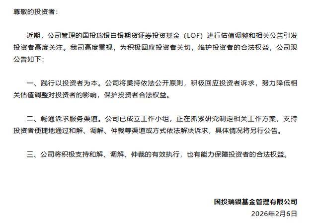 近日,国投白银LOF的估值调整引发投资者高度关注。2月6日,国投瑞银基金发布关于积极解决白银(LOF)基金投资者诉求有关事项的公告。