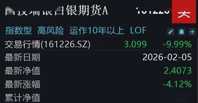 2月6日,国投瑞银白银LOF(上市型开放式基金)开盘再度跌停,报3.099元,这已是该基金连续第五个交易日跌停。