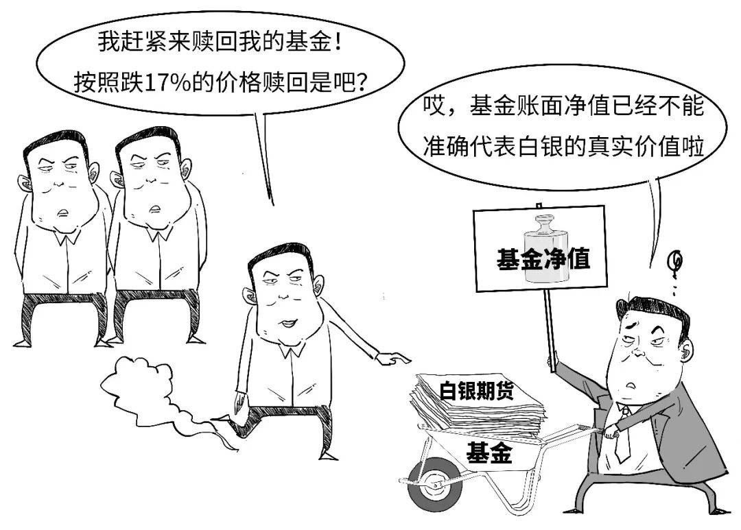 一个跌超30%,一个跌17%,白银期货合约的价格反而 远高于了白银本身的实际价值。对于当天先赎回的那批投资者会以“虚高”的净值退出。